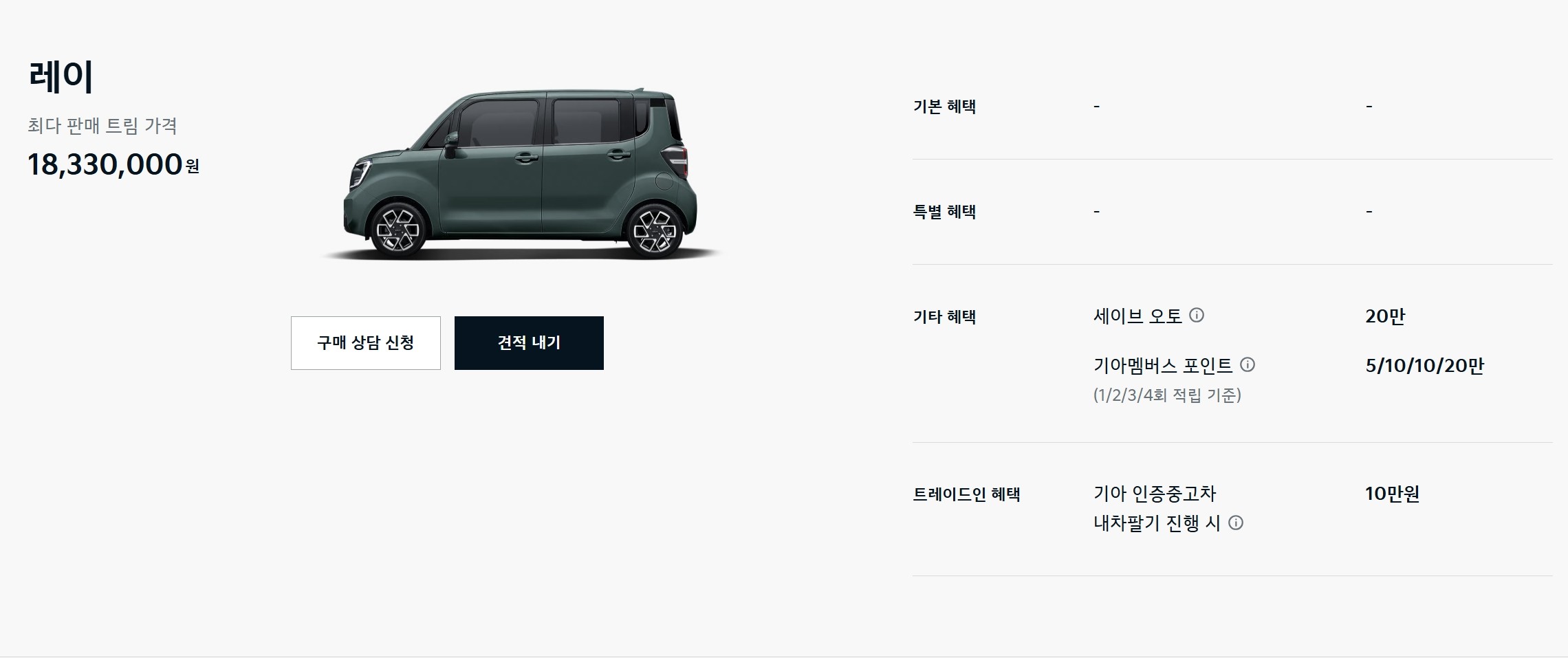 기아의 인기 모델인 기아 레이는 18,330,000원에 판매되며, 200,000원의 서비스 혜택과 50,000원에서 200,000원까지의 멤버십 포인트가 제공됩니다. 트레이드인 혜택도 100,000원이 있으니, 중고차를 고려하는 분들에게도 좋은 선택이 될 것입니다.