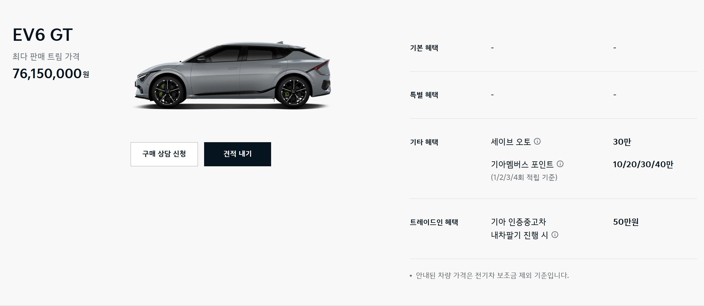 EV9 GT는 가격이 89,850,000원으로, 기본 혜택과 특별 혜택이 포함되어 있습니다. 이 모델 역시 서비스 옵션과 멤버십 포인트가 제공되며, 구매 상담 및 견적 요청 버튼이 있어 소비자들이 쉽게 접근할 수 있도록 되어 있습니다.