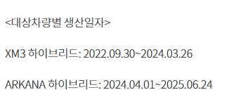 그 다음 차량은 르노코리아자동차 XM3 하이브리드입니다. 무상 수리하는 이유는 변속기 오일 씰(O링)의 마모의 의한 변속기 오일 누유 가능성이 있으며, 누유가 지속될 경우 경고등이 점등될 수 있는 가능성이 있어서 무상 수리하며 생산 일자는 2022년 9월30일부터 2023년11월15일까지 생산된 2731대에 한해서 무상 수리하며 기간은 2025년9월29일부터 2027년3월29일까지입니다.
