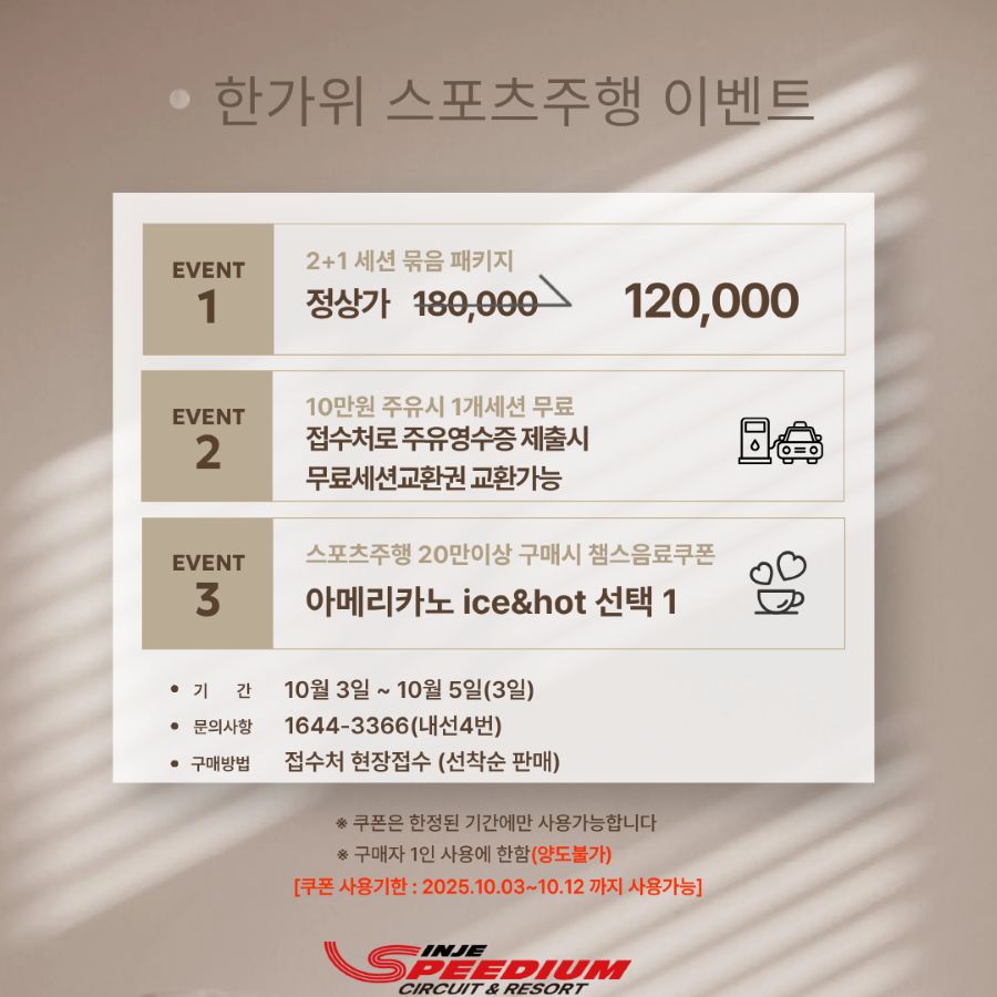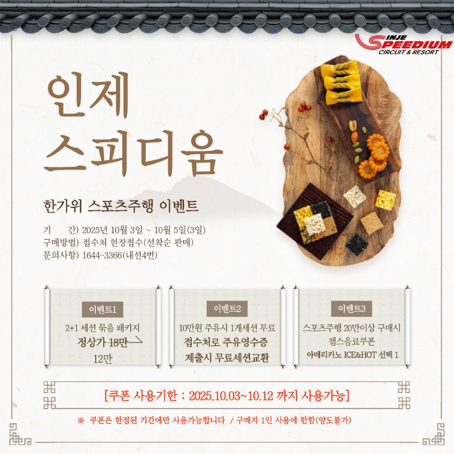 | [국내 모터스포츠 서킷] 인제스피디움 오피셜타이어 할인판매 이벤트 (0) | 2025.10.15 |
