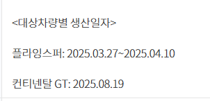 그 다음 차량은 플라잉스퍼 등 2차종에 대해 리콜하고 있습니다. 그 이유는 특정 기간 동안 생산/수입된 일부 차량의 연료 펌프 조립 공정에서 장비 오작동으로 인하여, 고압 연료 펌프가 실린더 헤드에 올바르게 고정되지 않았을 가능성이 있어서 리콜하며 해당 차종 및 생산 일자는 아래 확인부탁드리며 시정 기간은 지난 15일부터하고 있습니다.