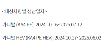 그 다음 차량은 기아 카니발 등 2차종에 대해 무상 수리를 하고 있습니다. 그 이유는 시동 OFF 상태에서도 2열 릴렉션 시트 제어기의 불필요한 전력 소모가 지속 발생될 수 있으며, 이런 경우 장기 주차시(약 1주 이상) 12V 배터리가 방전될 수 있는 가능성이 있어서 무상 수리하며 해당 차종 및 생산 일자는 아래 확인부탁드리며 무상 수리 기간은 2025년10월16일부터 2028년4월15일까지입니다.