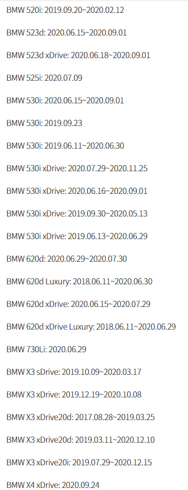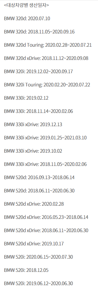 그 다음 차량은 BMW 320d 등 30차종에 대해 리콜하고 있습니다. 그 이유는 스타터 모터 내 수분이 유입되어 스타터 모터 내 단락이 발생되면 국부적으로 과열이 발생할 수 있어, 극히 드문 경우 차량 운행 및 주차 중 화재가 발생할 수 있어 리콜한다고 합니다. 해당 차종 및 생산 일자는 아래 확인부탁드리며 시정 기간은 어제(24일)부터하고 있습니다.