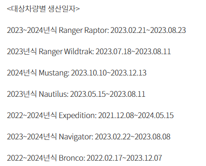 그 다음 차량은 포드 레인저 랩터 등 7차종에 대해 리콜하고 있습니다. 그 이유는 인포테인먼트 화면관련 소프트웨어 오류로 인해 인포테인먼트 화면이 정지되거나, 갑자기 시스템이 재부팅될 수 있습니다. 어라운드 뷰 (360º 카메라) 또는 후방 카메라 시스템 작동 중 이러한 현상이 발생되는 경우 주변 및/또는 후방 시야에 영향을 미쳐 충돌 위험을 증가할 가능성이 있어서 리콜하며 해당 차종 및 생산 일자는 아래 확인부탁드리며 시정 기간은 어제(24일)부터하고 있습니다.