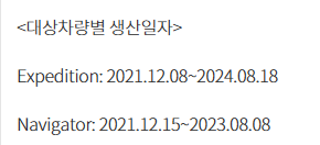 그 다음 차량은 포드 익스페디션 등 2차종에 대해 리콜하고 있습니다. 그 이유는 생산 라인에서 엔진 장착 절차 중에 브레이크 라인을 건드려 변형시킬 가능성이 있으며 이로 인해 브레이크 라인에 마찰이 발생되며 라인이 마모되어 브레이크액이 누유될 경우 제동 성능 저하로 인하여 차량 정지거리가 늘어나 사고가 발생할 가능성있어서 리콜하며 해당 차종 및 생산 일자는 아래 확인부탁드리며 시정 기간은 어제(24일)부터하고 있습니다.