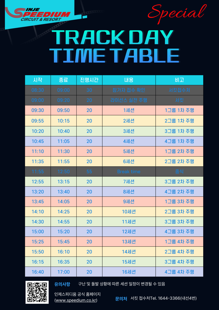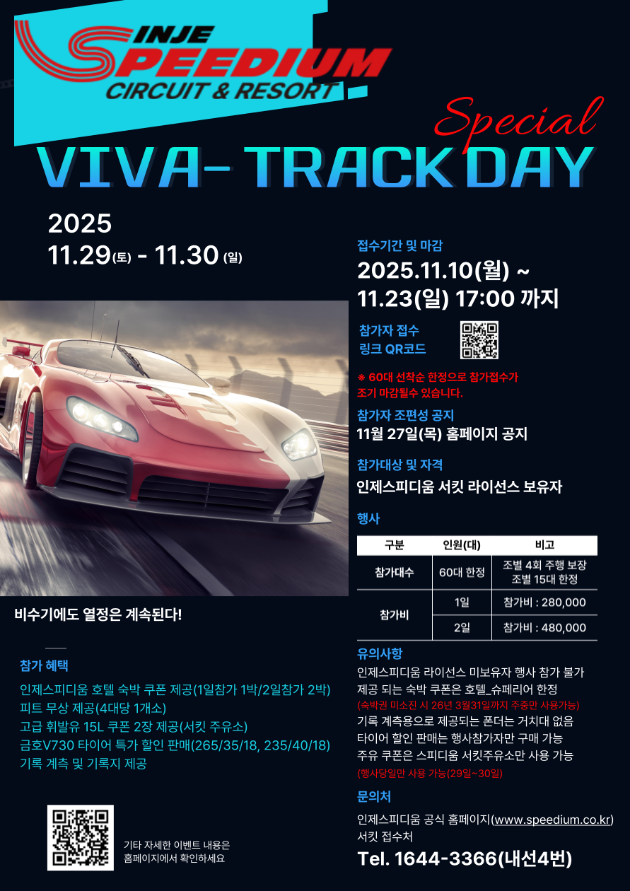 | [국내 모터스포츠 서킷] INJE SPEEDIUM VIVA-TRACK DAY 조편성 및 타임테이블 안내 (0) | 2025.11.28 |
