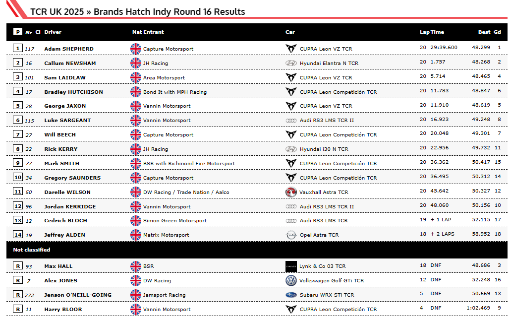 안녕하세요. 오토트랜드입니다. 이번 포스팅은 해외 모터스포츠 대회 경기 결과에 대해 포스팅을 하도록 하겠습니다. 바로 2025 TCR 영국 시리즈 16,17라운드입니다.TCR 시리즈는 2015년에 탄생한 시리즈이며 고비용 구조의 기존 레이스와 달리 레이스카의 개발비용과 팀 운영비용을 절감해 다양한 팀과 선수들이 출전할 수 있도록 진입 장벽을 낮춘 것이 특징입니다.따라서 TCR 레이스카를 TCR 시리즈에 출전할 수 있는 큰 장점을 가지고 있습니다. 전 세계 20개국에서 TCR 국가 시리즈를 하고 있습니다. TCR 영국 시리즈는 2018년에 시작하여 올해로 7번째 시즌을 맞이하고 있습니다, 16,17라운드는 11월 1일과 2일에 진행되었고 아래 경기 결과입니다.이로써 2025 TCR 영국 시리즈가 시즌 종료가 되었습니다. 추후에 2026 시즌일정에 대해 포스팅을 하도록 하겠습니다. 이상으로 이번 포스팅을 마치도록 하겠습니다.