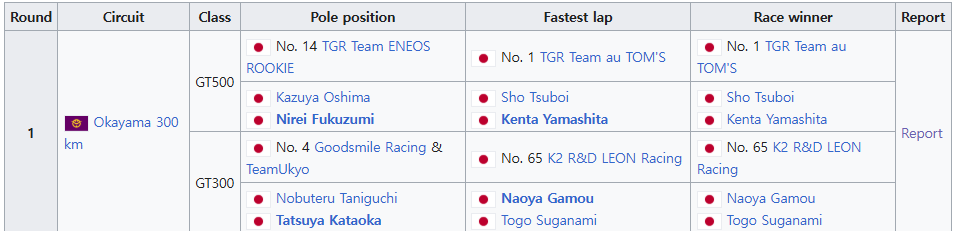 안녕하세요. 오토트랜드입니다. 이번 포스팅은 해외 모터스포츠 대회 경기 결과에 대해 알아보도록 하겠습니다. 바로 2025 일본 슈퍼 GT 대회 1라운드 경기 결과에 대해 알아보도록 하겠습니다. 일본 슈퍼 GT 대회는 일본 슈퍼 GT 대회는 일본을 대표하는 대회입니다.우리나라에 있는 CJ슈퍼레이스와 같은 급이라고 애기하고 싶습니다.1993년 창설하여 현재까지 이어지고 있습니다. 1라운드는 4월 12일부터 13일까지 오카야마 인터내셔널 서킷에서 레이스가 진행되었고 아래 경기 결과입니다. 2라운드는 5월 3일과 4일에 진행되었고 추후에 포스팅을 하도록 하겠습니다. 이상으로 이번 포스팅을 마치도록 하겠습니다.