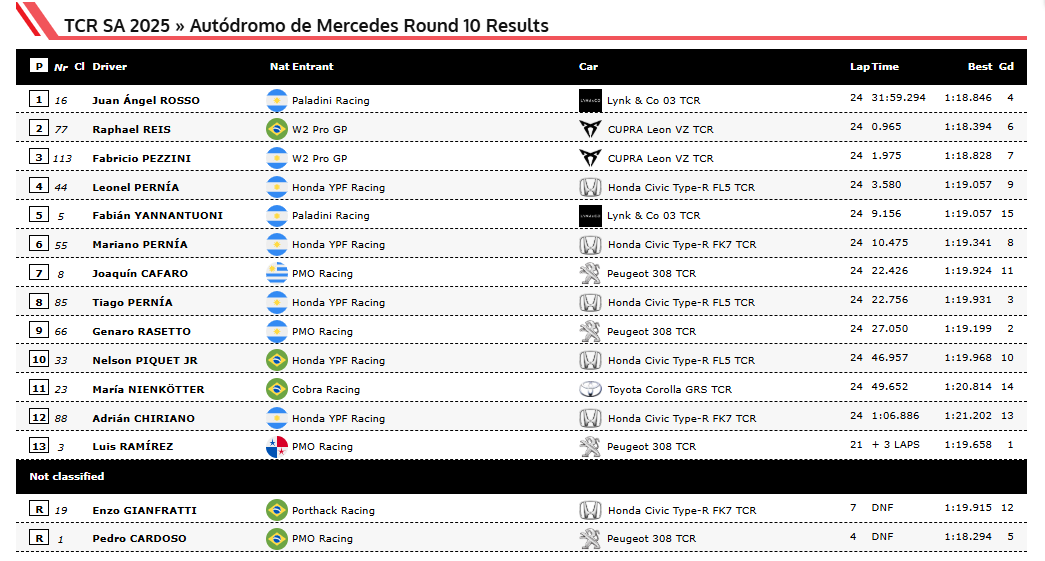 안녕하세요. 오토트랜드입니다. 이번 포스팅은 해외 모터스포츠 대회 경기결과에 대해 포스팅을 하도록 하겠습니다. 바로 TCR 남미 시리즈 9,10라운드 경기 결과입니다. TCR 시리즈는 FIA(국제 자동차 연맹)이 인증한 TCR 기술 규정을 적용한 TCR 시리즈입니다. 현재 약 20개국에서 TCR 레이스카로 시리즈를 진행하고 있습니다. 남미 시리즈는 2021년에 신설된 대회이며 올해로 5번째 시즌을 맞이하게 됩니다. 9,10라운드는 7월 13일에 진행되었습니다. 아래 경기 결과이며 11,12라운드는 7월 27일에 레이스가 진행되었습니다. 추후에 경기 결과에 대해 포스팅을 하도록 하겠습니다. 이상으로 이번 포스팅을 마치도록 하겠습니다.