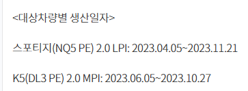 그 다음 차량은 기아 스포티지 2.0 LPI 등 2차종에 대해 무상 수리를 하고 있습니다. 그 이유는 CVVT 장치 센터볼트 생산 시 이너 스풀 오조립 발생으로 엔진경고등 발생 가능성이 확인됨에 따른 무상수리이며 해당 차종 및 생산 일자는 아래 확인부탁드리며 무상 수리 기간은 2025년11월26일부터 2028년5월25일까지입니다.