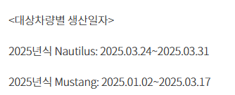 그 다음 차량은 현대차 넥쏘입니다. 무상 수리하는 이유는 연료전지 제어유닛(FCU) 소프트웨어 로직 설정 미흡으로 인하여 연료전지 시스템 점검문구가 점등될 수 있는 가능성이 확인됨에 따른 무상수리이며 생산 일자는 2025년5월9일부터 2025년9월22일까지 생산된 269대에 한해서 무상 수리하며 기간은 지난 27일부터하고 있습니다.