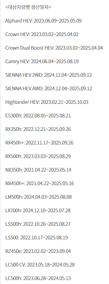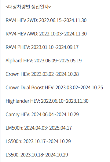 그 다음 차량은 토요타 알파드 HEV 등 20차종에 대해 리콜하고 있습니다. 그 이유는 주차 보조 ECU의 소프트웨어 오류로 인해 시동 직후에 후진 기어 조작을 하거나, 짧은 시간내에 시동 을 반복할 경우 후방 영상이 일시적으로 정지하거나 표시되지 않을 가능성이 있어서 리콜하며 해당 차종 및 생산 일자는 아래 확인부탁드리며 시정 기간은 지난 18일부터하고 있습니다.