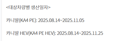 그 다음 차량은 기아 카니발 등 2차종에 대해 무상 수리를 하고 있습니다. 그 이유는 내비게이션 시스템 소프트웨어 내부 로직 오류로 해당 차량에 탑재되지 않은 '세차 모드' 기능이 AVN 설정 메뉴에 잘못 표출될 수 있는 가능성이 있어서 무상 수리하며 해당 차종 및 생산 일자는 아래 확인부탁드리며 무상 수리 기간은 2025년12월15일부터 2028년6월14일까지입니다.