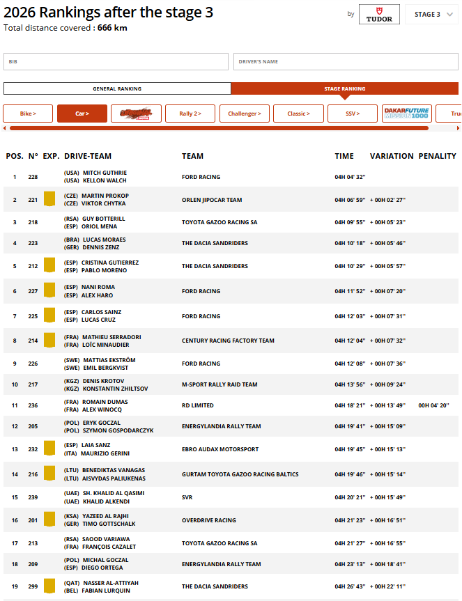안녕하세요. 오토트랜드입니다. 이번 포스팅은 해외 모터스포츠 대회 경기 결과에 대해 포스팅을 하도록 하겠습니다. 바로 2026 다카르 랠리 경기 결과입니다. 다카르 랠리는 인간의 엔진 달린 지상용 탈것으로 할 수 있는 가장 극한의 레이스 중 하나로 알려진 대회입니다. 자동차뿐만 아니라 오토바이,4륜 자동차 등등 다양한 차량들이 극한의 레이스가 출전하고 있습니다. 이번 경기 결과는 3단계이며 1월 6일에 레이스가 했고 시작은 얄룰라에서 얄룰라로 마무리가 되었습니다. 아래 경기 결과이며 추후에 4단계 경기 결과에 대해 포스팅을 하도록 하겠습니다. 이상으로 이번 포스팅을 마치도록 하겠습니다.