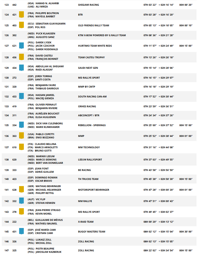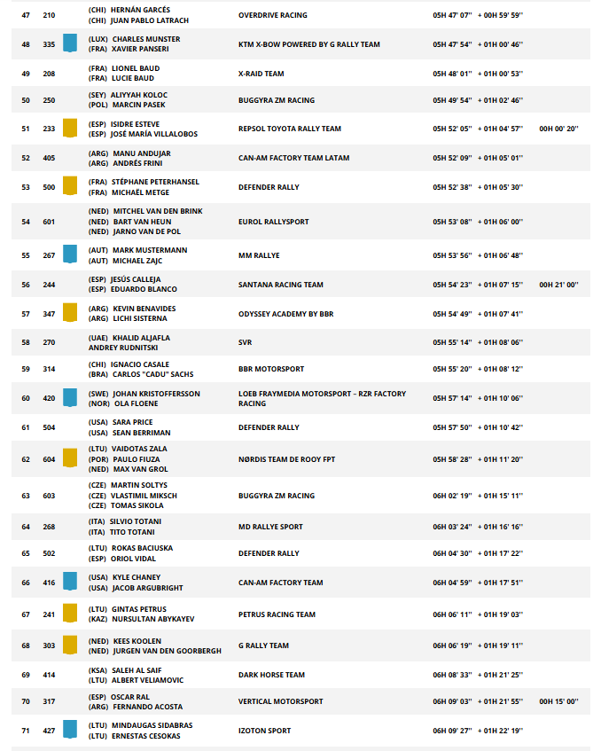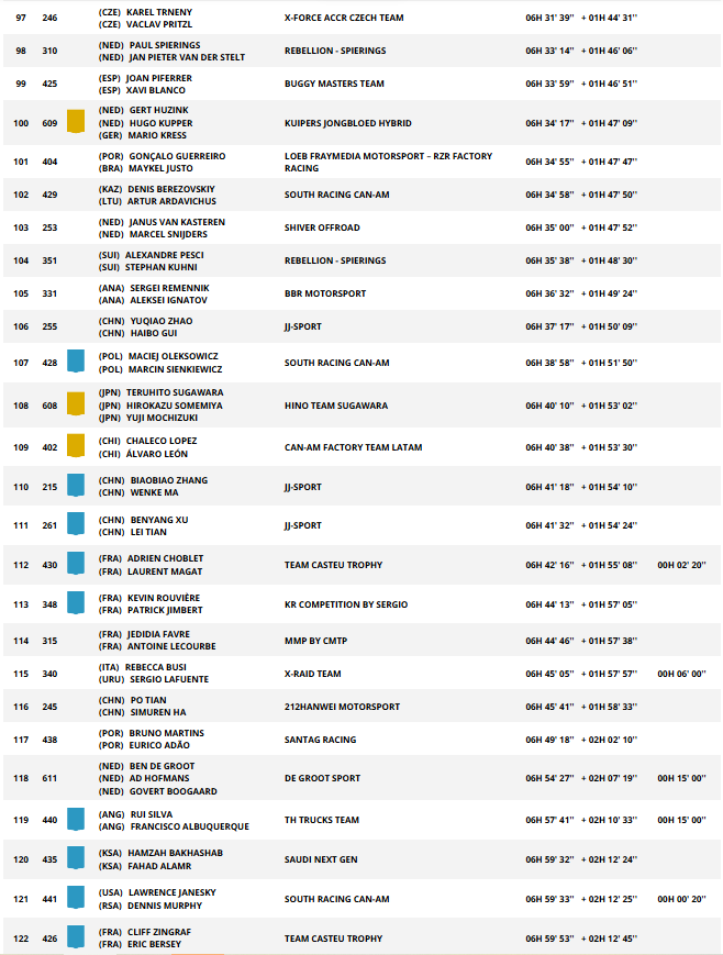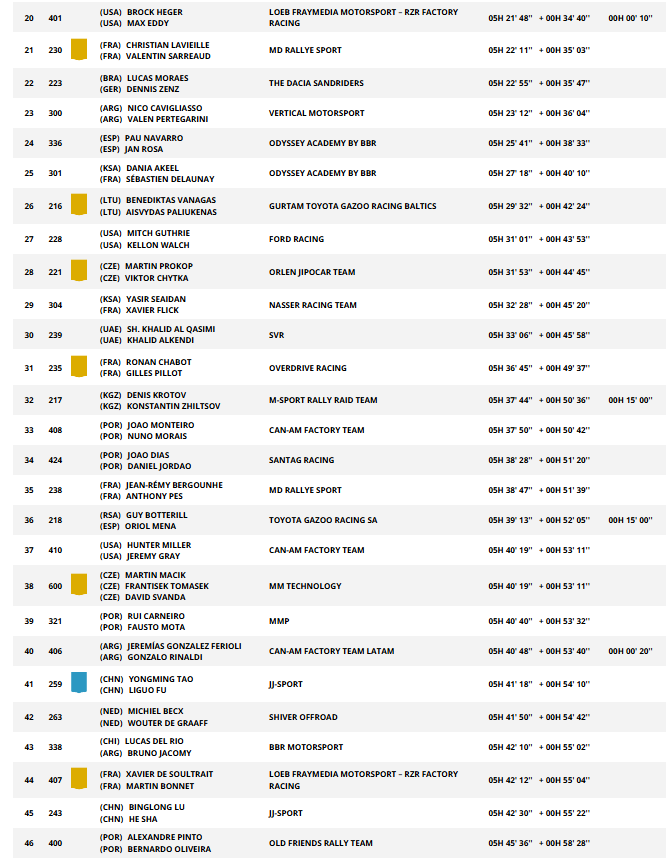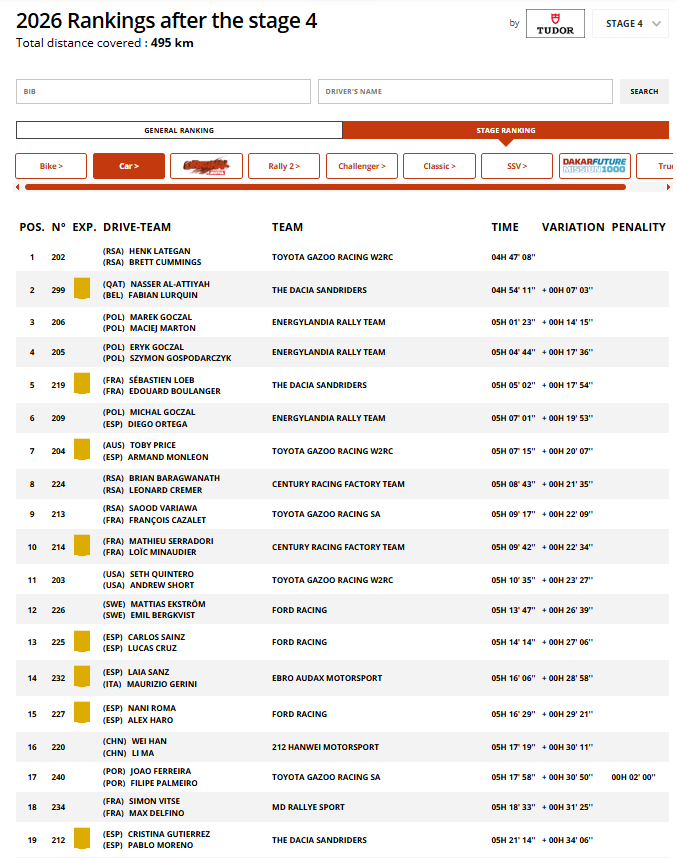 안녕하세요. 오토트랜드입니다. 이번 포스팅은 해외 모터스포츠 대회 경기 결과에 대해 포스팅을 하도록 하겠습니다. 바로 2026 다카르 랠리 경기 결과입니다. 다카르 랠리는 인간의 엔진 달린 지상용 탈것으로 할 수 있는 가장 극한의 레이스 중 하나로 알려진 대회입니다. 자동차뿐만 아니라 오토바이,4륜 자동차 등등 다양한 차량들이 극한의 레이스가 출전하고 있습니다. 이번 경기 결과는 4단계이며 1월 7일에 레이스가 했고 시작은 얄룰라에서 야영지 피난처에 마무리가 되었습니다. 아래 경기 결과이며 추후에 5단계 경기 결과에 대해 포스팅을 하도록 하겠습니다. 이상으로 이번 포스팅을 마치도록 하겠습니다.