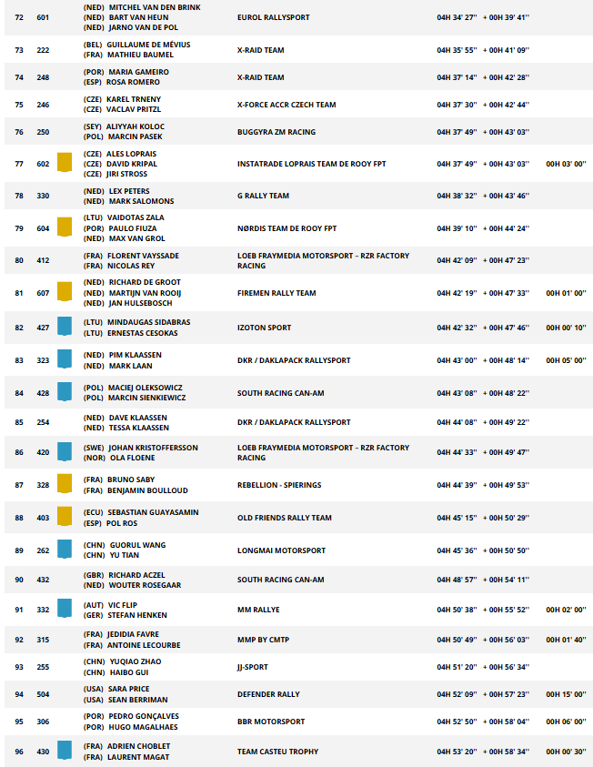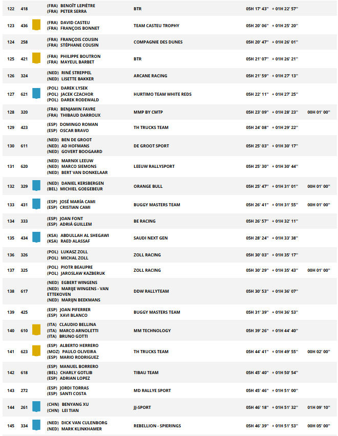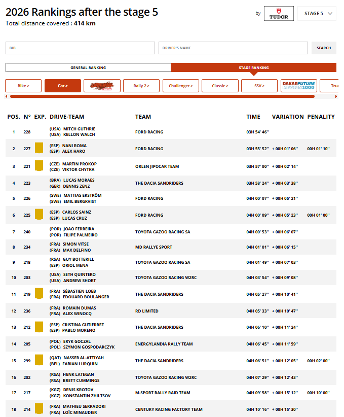 안녕하세요. 오토트랜드입니다. 이번 포스팅은 해외 모터스포츠 대회 경기 결과에 대해 포스팅을 하도록 하겠습니다. 바로 2026 다카르 랠리 경기 결과입니다. 다카르 랠리는 인간의 엔진 달린 지상용 탈것으로 할 수 있는 가장 극한의 레이스 중 하나로 알려진 대회입니다. 자동차뿐만 아니라 오토바이,4륜 자동차 등등 다양한 차량들이 극한의 레이스가 출전하고 있습니다. 이번 경기 결과는 5단계이며 1월 8일에 레이스가 했고 시작은 아영지에서 우박에서 마무리가 되었습니다. 아래 경기 결과이며 추후에 6단계 경기 결과에 대해 포스팅을 하도록 하겠습니다. 이상으로 이번 포스팅을 마치도록 하겠습니다.