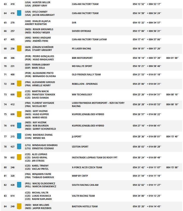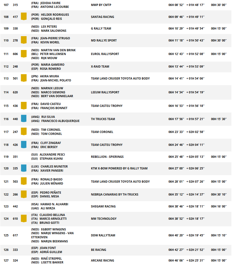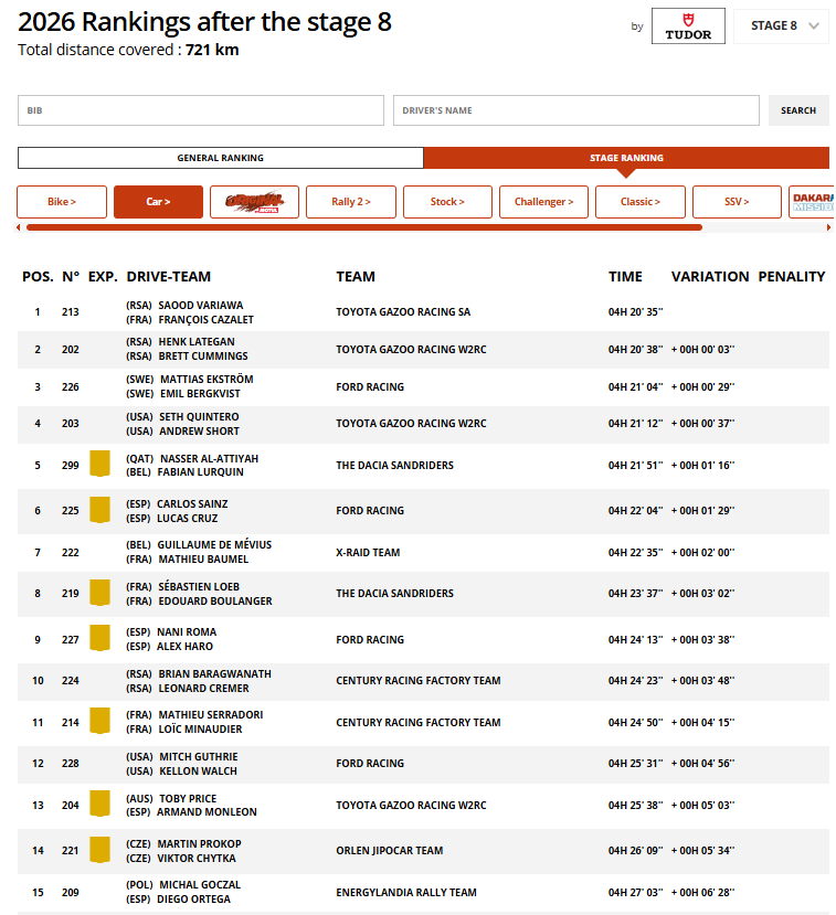 안녕하세요. 오토트랜드입니다. 이번 포스팅은 해외 모터스포츠 대회 경기 결과에 대해 포스팅을 하도록 하겠습니다. 바로 2026 다카르 랠리 경기 결과입니다. 다카르 랠리는 인간의 엔진 달린 지상용 탈것으로 할 수 있는 가장 극한의 레이스 중 하나로 알려진 대회입니다. 자동차뿐만 아니라 오토바이,4륜 자동차 등등 다양한 차량들이 극한의 레이스가 출전하고 있습니다. 이번 경기 결과는 8단계이며 1월 12일에 레이스가 했고 시작은 와디 광고 다와시에서 와디 광고 다와시에서 마무리가 되었습니다. 아래 경기 결과이며 추후에 9단계 경기 결과에 대해 포스팅을 하도록 하겠습니다. 이상으로 이번 포스팅을 마치도록 하겠습니다.