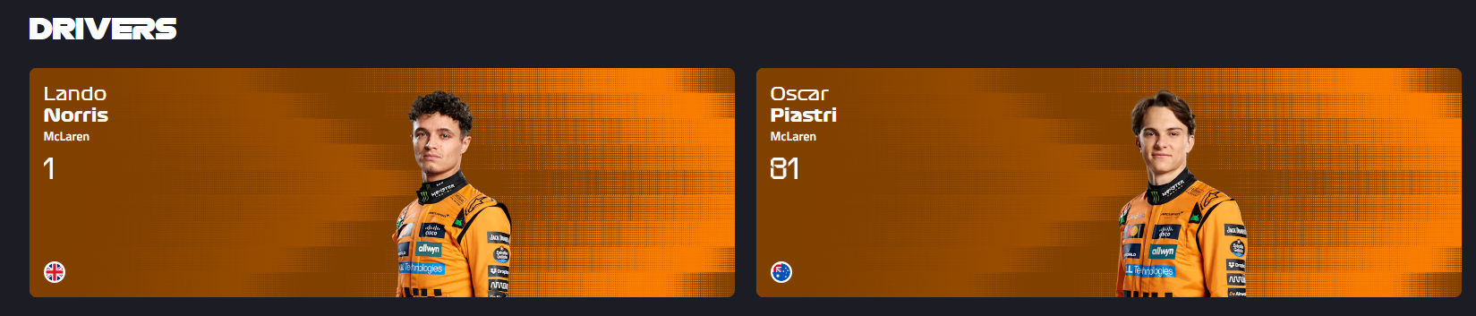 맥라렌 F1팀은 이번 시즌에는 랜도 노리스와 오스카 피아스트리 드라이버가 팀과 함께 대회에 출전하고 있으며 레이스카는 MCL40 레이스카를 타고 출전 중이며 두 드라이버에 대한 자세한 소개는 "해외 모터스포츠 드라이버" 카테고리에서 포스팅을 하도록 하겠습니다.엔트리 넘버는 1번(랜도 노리스),81번(오스카 피아스트리)입니다.이상으로 이번 포스팅을 마치도록 하겠습니다.
