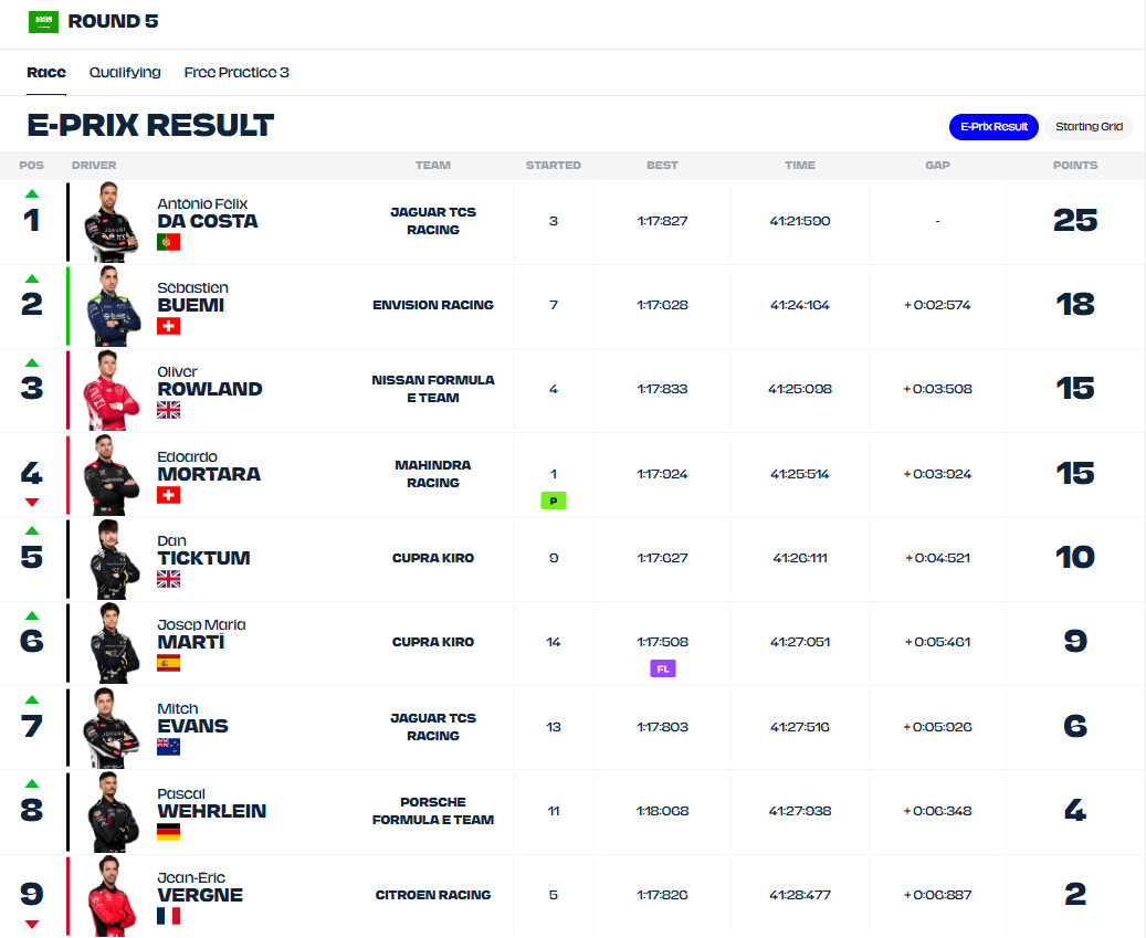 안녕하세요.오토트랜드입니다. 이번 포스팅은 해외 모터스포츠 대회 경기 결과에 대해 포스팅을 하도록 하겠습니다. 바로 2025/26 시즌 포뮬러 E 대회 5라운드 경기결과입니다. 포뮬러 E 대회는 국제 자동차 연맹에서 유일한 인증 받은 전기 레이스 대회입니다. 최근 모터스포츠 대회에서도 내연기관에서 전동화를 전환하면서 전기 레이스 대회들이 나오고 있습니다. 포뮬러 E는 이번 시즌이 11번째 시즌이며 5라운드는 제다 코르니쉬 서킷에서 레이스가 진행되었으며 아래 경기 결과입니다. 6라운드는 2026년 3월 21일 스페인에서 진행될 예정이 추후에 포스팅을 하도록 하겠습니다. 이상으로 이번 포스팅을 마치도록 하겠습니다.