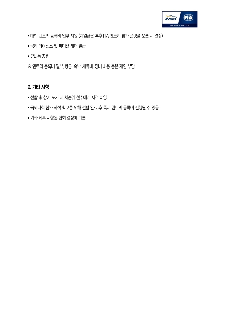 안녕하세요. 오토트랜드입니다. 이번 포스팅은 국내 모터스포츠에 대해 알아보도록 하겠습니다. 바로 대한자동차경주협회에서 2026 FIA Arrive & Drive Karting World Cup 한국대표 선발을 한다고 합니다. 국내에서 시니어 및 주니어 클래스 한해서 선발을 하며 작년 성적과 이번 시즌 RMC 및 KIC 1라운드 성적을 합하여 선발을 한다고합니다. 선발이 된다면 다음과 같은 일정으로 진행되며 협회 지원이 있다고 합니다. 좋은 성적이 거두어 한국 대표로 선발하기 바라며 이상으로 이번 포스팅을 마치도록 하겠습니다.