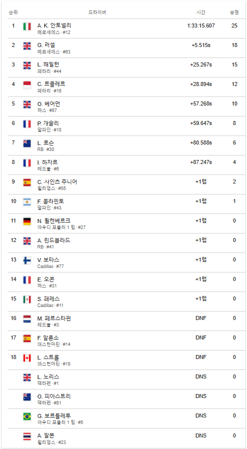 | [해외 모터스포츠 대회 경기결과]- 2026 포뮬러 원 오스트리아 그랑프리 경기 결과 (0) | 2026.03.20 |