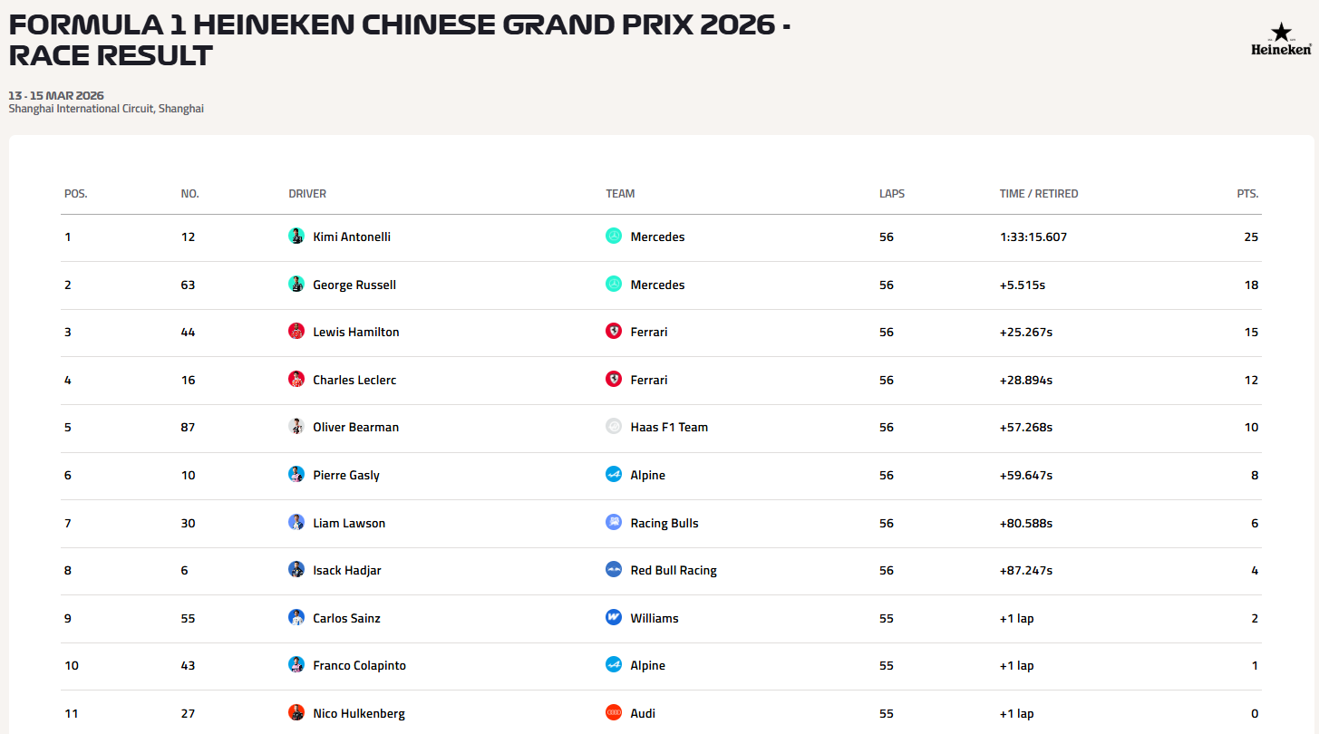 안녕하세요. 오토트랜드입니다. 이번 포스팅은 해외 모터스포츠 대회 경기 결과에 대해 알아보도록 하겠습니다. 바로 포뮬러 원 2라운드 경기결과입니다. 포뮬러 원 대회는 세계 3대 스포츠 중에 하나로 한 그랑프리당 온,오프라인을 합쳐서 100만 명에 달하는 막대한 영향력과 인지도를 가지고 있는 대회입니다. 2라운드는 3월 15일 상하이 안터내셔널 서킷에서 중국 그랑프리가 진행되었습니다. 아래 경기 결과이며 2라운드는 3월 29일에 일본 그랑프리로 진행될 예정기고 추후에 포스팅을 하도록 하겠습니다. 이상으로 이번 포스팅을 마치도록 하겠습니다.