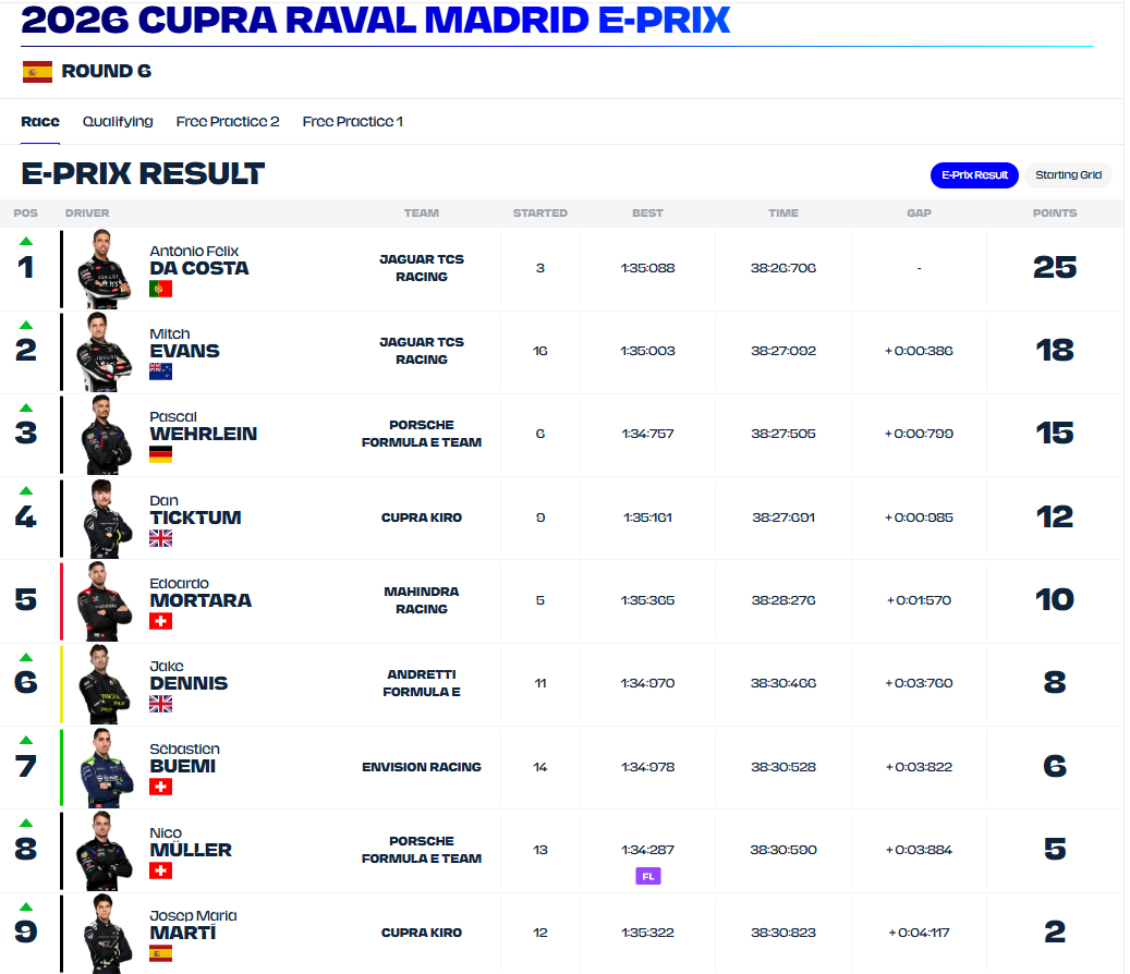 안녕하세요.오토트랜드입니다. 이번 포스팅은 해외 모터스포츠 대회 경기 결과에 대해 포스팅을 하도록 하겠습니다. 바로 2025/26 시즌 포뮬러 E 대회 6라운드 경기결과입니다. 포뮬러 E 대회는 국제 자동차 연맹에서 유일한 인증 받은 전기 레이스 대회입니다. 최근 모터스포츠 대회에서도 내연기관에서 전동화를 전환하면서 전기 레이스 대회들이 나오고 있습니다. 포뮬러 E는 이번 시즌이 11번째 시즌이며 6라운드는 하라마 순환로에서 레이스가 진행되었으며 아래 경기 결과입니다. 7라운드는 2026년 5월 2일 독일에서 진행될 예정이 추후에 포스팅을 하도록 하겠습니다. 이상으로 이번 포스팅을 마치도록 하겠습니다.