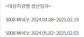 그 다음 차량은 푸조 3008 MHE 등 2치종에 대해 리콜하고 있습니다. 그 이유는 볼조인트 브라켓 고정 볼트가 파손될 경우, 로우암을 고정해주지 못해 핸들을 이용한 바퀴 방향 조작이 안될 수 있고, 이로 인해 사고가 발생할 가능성이 있어서 리콜하며 해당 차종 및 생산 일자는 아래 확인부탁드리며 시정 기간은 어제(3일)부터하고 있습니다.
